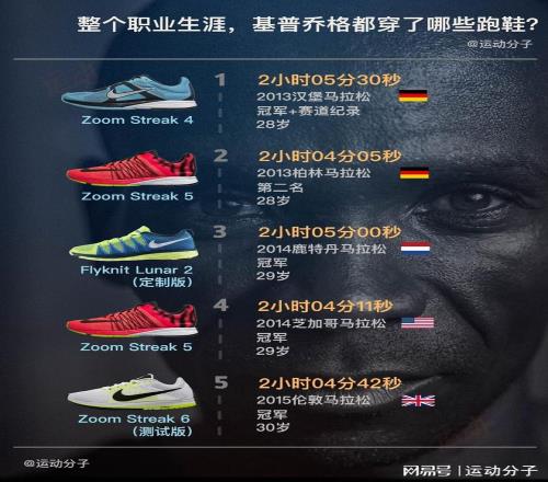盘点整个职业生涯,埃鲁德基普乔格穿过的跑鞋 从2013年28岁第一场马拉松,到上一年行将41岁时宣告完毕职业生涯,埃鲁德·基普乔格(Eliud Kipchoge)根本保持了每一年(龄)只跑两场马拉松的节奏。26场马拉松/马拉松间隔,其中正赛23场,他拿下15个冠军,连任2届奥运会金牌,也两次打破过世界纪录。行将38岁时跑出的2小时01分09秒...